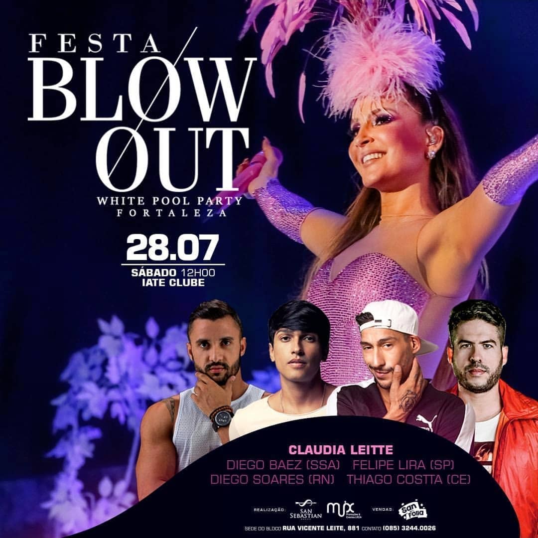 Comandada pelo grupo San Sebastian, a festa Blow Out chegará a Fortaleza, no final deste mês. Tendo Claudia Leitte como atração principal, o evento acontecerá a partir do meio dia de sábado, 28 de julho, depois de já ter agitado cidades como Salvador (BA) e Natal (RN). Com a temática White Pool Party, a festa tem o apoio do Fortal e Ciel.
