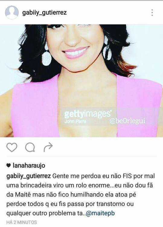 No caso de Maite, parece que não passou de comentários nonsense de uma hater. Após o episódio tomar proporções maiores, a usuária da conta no Instagram, que deve ter apenas 11 anos de idade, ficou com medo e se desculpou pelos comentários contra a mexicana: